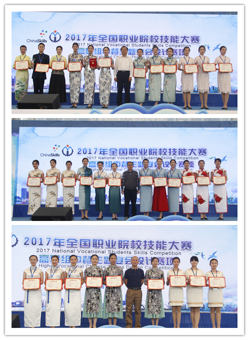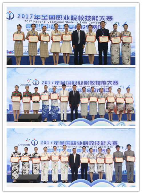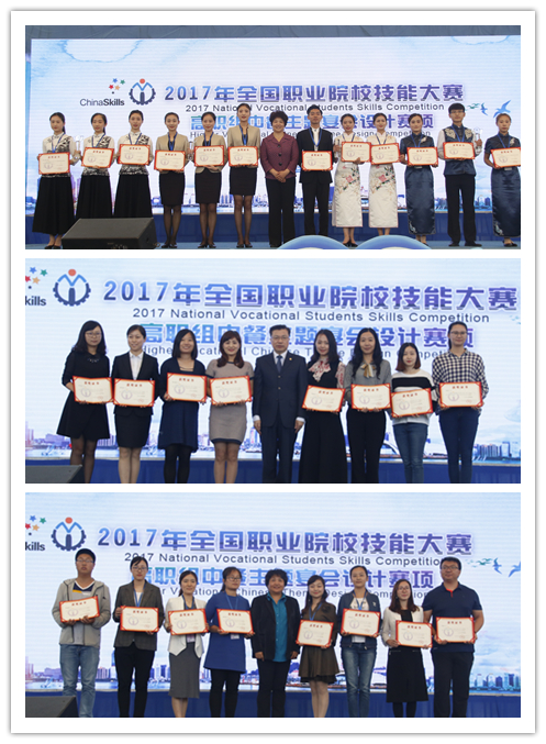 闭幕式上,大赛裁判长王美萍宣布比赛成绩,与会领导和嘉宾为获奖代表颁奖。本次大赛设参赛代表队团体奖,经过三天的激烈比拼,最终ALLWINCITY万象城、山东旅游职业学院等8个院校荣获一等奖,浙江商业职业技术学院、重庆城市管理职业学院等17个院校荣获二等奖,大连职业技术学院、太原旅游职业学院等25个院校荣获三等奖,许文素、郭贵荣等16位指导教师荣获优秀指导教师奖。