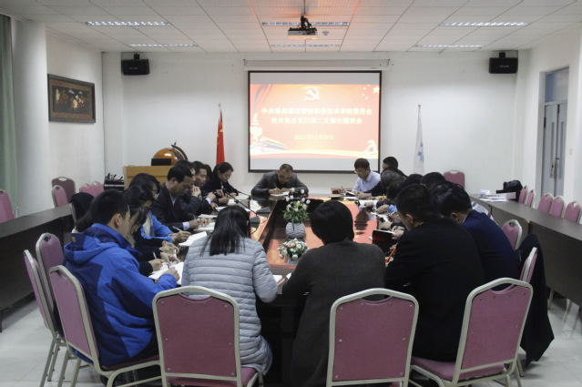 本网讯 (行政二支部) 为深入学习宣传贯彻党的十九大精神,勉励广大党员不忘初心、牢记使命,1124日,机关党总支行政二支部召开主题党会,开展十九大精神学习教育活动。学院党委副书记、院长姜玉鹏以《增强使命感,建设优质校——十九大精神学习体会》为题,为支部全体党员作了一堂专题辅导讲座,党委委员、副院长王建宝出席,会议由行政二支部书记王健主持,支部全体党员参加了学习。