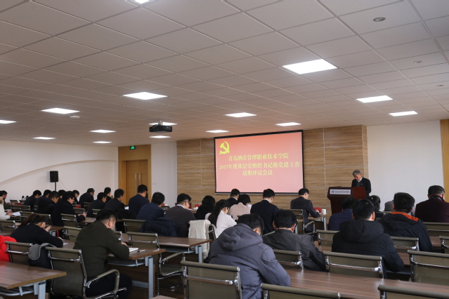 本网讯 (组织人事处 王慧勇) 12月26日下午,学院召开2017年度党总支(支部)书记抓党建工作述职评议会议。青岛市委高校工委思政处处长高桥、主任科员王秀婷,学院党委书记李达,党委副书记、院长姜玉鹏,党委副书记于敏,党委委员、副院长王建宝,党委委员、副院长商士海,党委委员、副院长刁洪斌,党委委员、副院长宫恩龙出席会议。李达主持会议并讲话。