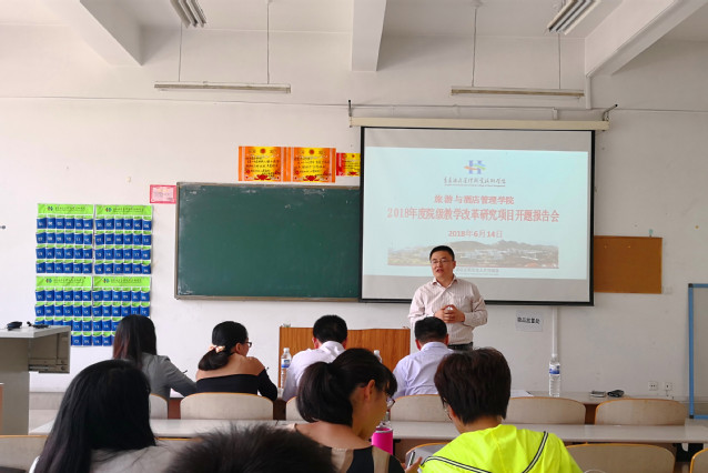 本网讯(旅游与酒店管理学院 刘芬)6月14日下午,旅游与酒店管理学院召开2018年度院级教学改革研究项目开题报告会,邀请由中国海洋大学管理学院旅游学系副教授蔡礼彬、山东外贸职业学院经济管理系副主任张祖国、旅游与酒店管理学院副院长石媚山及副高级教师代表李峰、于英等组成的专家组对我院2018年度院级教学改革研究立项项目进行了开题指导。各项目组主持人以及主要成员参会。