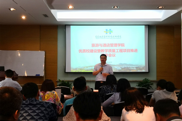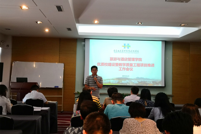 本网讯(旅游与酒店管理学院 杨轶哲)为深入落实学院优质校建设的相关工作要求,统筹优质校建设、教学质量工程建设各个项目的建设进度,按照“成果导向、强化建设、重在落实、目标考核”的思路, 6月21日,旅游与酒店管理学院在旅游酒店实训中心多功能厅召开优质校建设暨教学质量工程项目推进工作会议,教务处处长唐文君、旅游与酒店管理学院副院长石媚山以及全体教师参加了此次会议,会议由旅游与酒店管理学院办公室副主任王超主持。