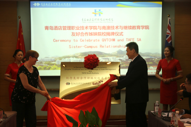 本网讯(国际交流与合作处 邵常恩)7月20日上午,我院和澳大利亚南澳技术与继续教育学院(TAFE SA)在旅游与酒店管理学院实训中心多功能厅举行友好合作姊妹院校揭牌仪式暨TAE40116四级教师培训证书颁发仪式。