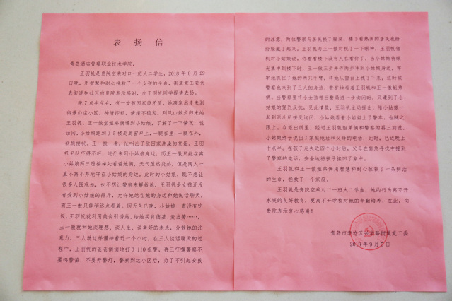 本网讯(党委宣传部 李代玉)9月6日,学院收到了来自青岛市李沧区兴华路街道党工委一封表扬信,特别感谢王羽帆同学,她在8月29日晚和弟弟一起用智慧和勇气拯救了一个鲜活的生命,挽救了一个家庭,向王羽帆同学提请表扬。