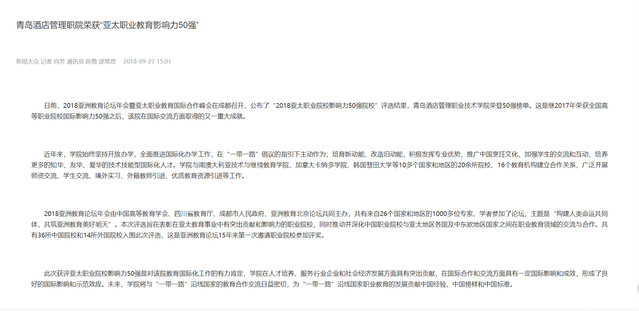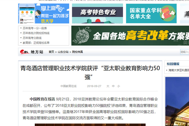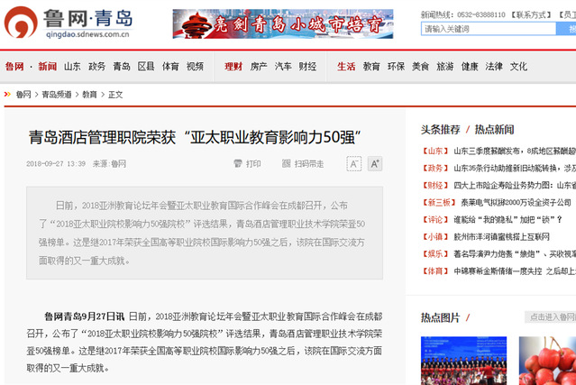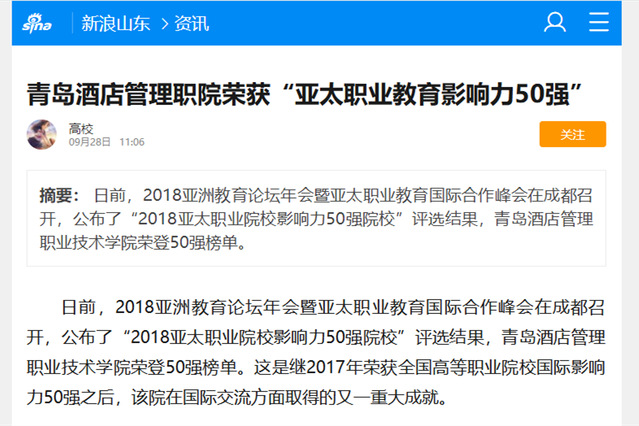 本网讯(党委宣传部 于克晓)连日来,新浪网、大众网、鲁网、中国教育在线等多家媒体报道我院荣获“亚太职业院校影响力50强”殊荣。