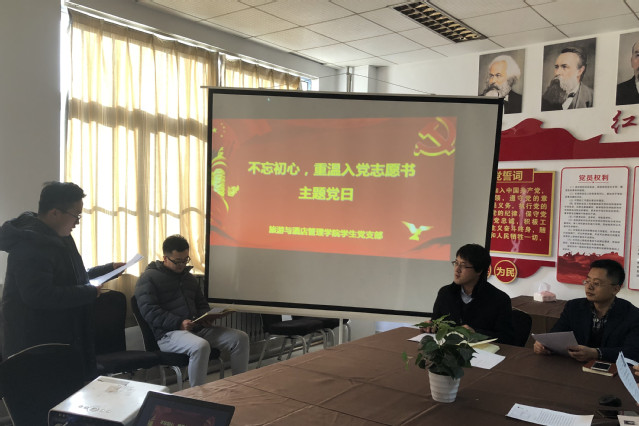 本网讯(旅游与酒店管理学院 李艳)近日,旅游与酒店管理学院学生党支部在党员活动室举行“不忘初心,重温入党志愿书”主题党日活动,学生支部9 名党员同志参加活动。