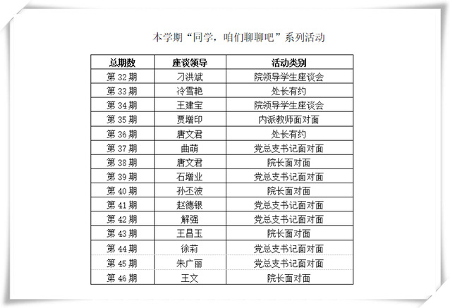 本网讯(学生工作处 陈超)近日,随着第46期“同学,咱们聊聊吧”活动的结束,本学期“同学,咱们聊聊吧”系列活动落下帷幕。