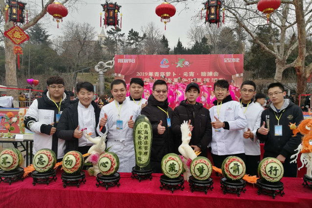 本网讯(烹饪学院 张会强)近日,从2019年青岛萝卜元宵糖球会组委会传来喜讯,烹饪学院青年教师丁德龙带领学生在萝卜雕刻比赛中荣获一等奖两项、二等奖五项、三等奖一项、优秀奖一项,其中丁德龙的作品“筑梦前行”荣获萝卜雕刻比赛一等奖第一名。
