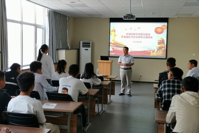 刁洪斌首先进行了自我介绍,分享了自己的学习工作经历。他认真询问了每位同学的姓名及籍贯,向同学们介绍了学院的发展历史和未来规划,与同学们展开亲切互动,使同学们对学院的文化、历史、整体状况有了更加全面的了解和认识。刁洪斌就国庆节安全及其他安全问题进行专题教育。他表示,今年是新中国成立70周年,每位同学要做好自身的政治安全和意识形态安全,时刻注意人身和财产安全,杜绝校园贷和传销组织等非法活动,做好心理疾病的预防,使自己能够健康快乐融入校园生活,不断提升综合素养,取得新成绩。