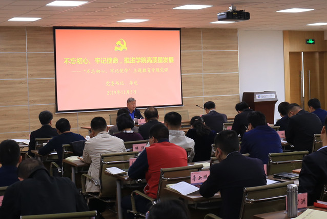 李达以《不忘初心、牢记使命,推进学院高质量发展》为题,从中国共产党人的初心和使命讲起,畅谈了学习习近平新时代中国特色社会主义思想的认识,以及在新时代牢记全心全意为人民服务根本宗旨的感悟。李达指出,“不忘初心、牢记使命”主题教育的总要求是守初心、担使命,找差距、抓落实。守初心,就是牢记全心全意为人民服务的根本宗旨,以坚定的理想信念坚守初心,牢记人民对美好生活的向往就是我们的奋斗目标,时刻不忘我们党来自人民、根植人民,永远不能脱离群众、轻视群众、漠视群众疾苦。这个初心,需要以坚定的理想信念来坚守,更需要以勇于担当作为来践行。李达指出,“全心全意为人民服务”最直接最现实的体现就是坚持以师生为中心,一切为了师生,为了一切师生,为了师生一切,把师生拥护不拥护、赞成不赞成、高兴不高兴作为制定政策的依据,作为检验工作成效的标准。