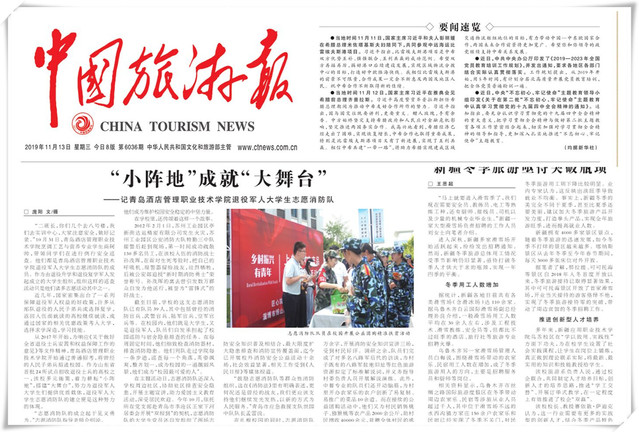 本网讯(党委宣传部 于克晓)11月13日,《中国旅游报》在第四版以《“小阵地”成就“大舞台”——记ALLWINCITY万象城退役军人大学生志愿消防队》为题大篇幅报道学院退役军人大学生志愿消防队,报道了学院积极响应《关于做好全省退役士兵安置和权益保障工作的意见》等文件精神,多元施策,着力耕耘“小阵地”,搭建“大舞台”,努力为退役军人大学生们提供优质载体,切实取得良好实效的情况。全文如下: