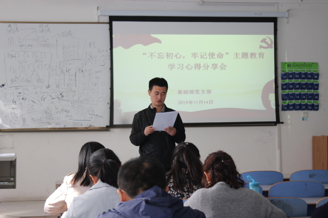 11月14日下午,基础部党支部举办“不忘初心、牢记使命”主题教育学习分享会。支部书记董瑞虎以《坚定理想、牢记使命,做一名合格共产党员》为题,向与会党员分享了主题教育学习的收获和感悟。会议认为,通过开展主题教育,党员同志们更加坚定了对马克思主义的信仰,更加坚定了对以习近平同志为核心的党中央的信赖,更加坚定了实现中华民族伟大复兴中国梦的信心。全体党员要守住初心,加强学习,提升水平,不负教育工作者教书育人的光荣使命。