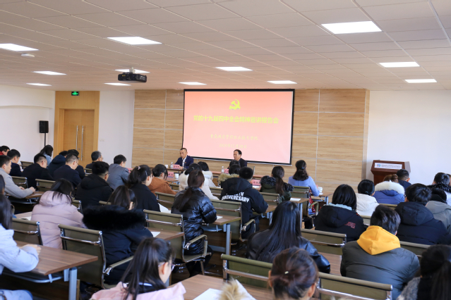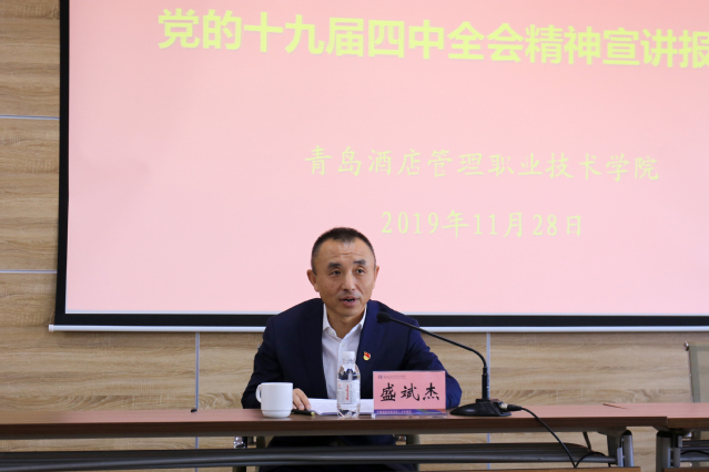 本网讯(党委宣传部)11月28日上午,按照青岛市委统一部署安排,青岛市委宣讲团成员、市发展改革委党组副书记、副主任盛斌杰来学院宣讲党的十九届四中全会精神。学院领导班子成员,副科级以上干部、教师党支部书记、思想政治理论课教师、辅导员和学生代表共120余人参加报告会。副院长王建宝主持宣讲报告会。