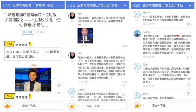 本网讯(旅游与酒店管理学院 张妍)近期,旅游与酒店管理学院利用晚自习时间,组织全体大一学生集体收看《新闻联播》,并在易班平台举办关注时政、关爱祖国之——“主播说联播,‘金句’我也说”活动。在学院易班平台超过1000人次访问,200多名同学积极留言互动。