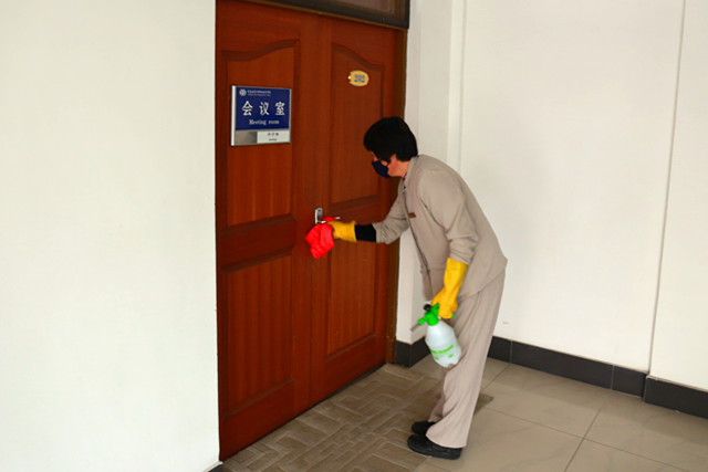 总务处购置防疫消杀物资,按照“一日一消毒”制度,由物业人员投洒过氧乙酸进行空气消毒和“84”消毒液对学校办公教学环境、集体群居场所、学生宿舍等进行消毒,全方位不留死角地喷洒消毒,对值班场所等有人员区域增加消毒频次,对门把手、水龙头、电梯按钮等手触部位,进行擦拭消杀,尽力做到最大程度消毒杀菌。