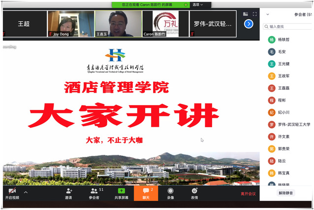本网讯(酒店管理学院 吴凡)3月5日,酒店管理学院邀请万豪基金会万礼豪程教学项目团队为全体教师开展了以“如何进行教学设计”为主题的线上讲座活动,这是酒店管理学院品牌讲座活动“大家开讲”的首场活动。酒店管理学院院长王昌玉、党总支副书记徐莉、副院长尹萍及全体教师参加讲座。