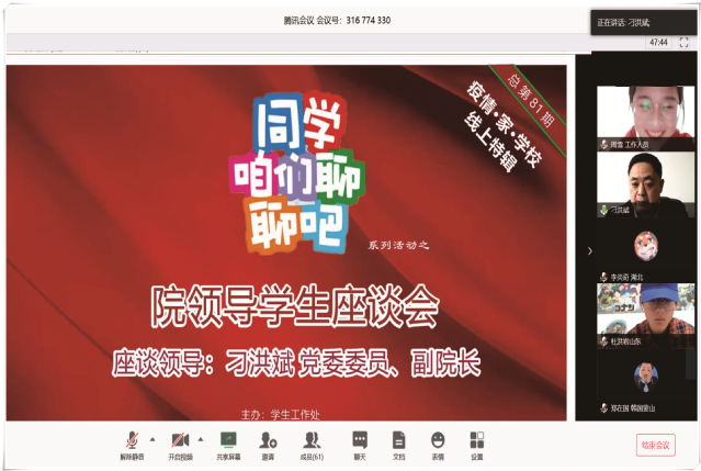 本网讯(学生工作处 陈超)3月14日上午,学院以“疫情 家 学校”为主题,举行新学期首期“同学,咱们聊聊吧”,这是活动开展五年来首次在线上举行。学院副院长刁洪斌、学工处处长赵明富与来自18个省市自治区的52名学生进行了线上座谈。