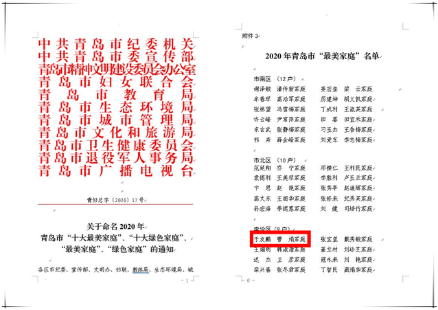 本网讯(艺术学院 谢彬)2020年“国际家庭日”前夕,学院教师于友鹏家庭获评2020年青岛市“最美家庭”荣誉称号,这是该家庭获评山东省第三届“齐鲁书香之家”后又一荣誉。