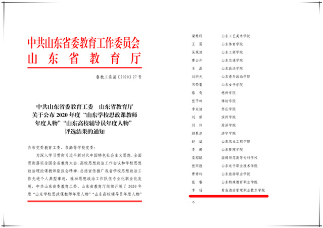 本网讯(马克思主义学院)9月30日,省教育工委、省教育厅下发《关于公布2020年度“山东学校思政课教师年度人物”“山东高校辅导员年度人物”评选结果的通知》(鲁教工委函〔2020〕27号),马克思主义学院副院长李瑶获评“山东学校优秀思政课教师”。