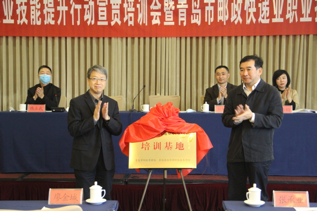 本网讯(继续教育学院 廖金城)10月29日,快递从业人员职业技能提升行动宣贯培训会暨青岛市邮政快递业职业技能培训基地揭牌仪式在黄海饭店举行。学院副院长宫恩龙带队参会,并与青岛市邮政管理局局长王华一同为培训基地揭牌。