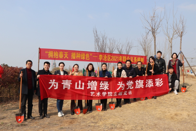 本网讯(艺术学院 于友鹏) 3月12日下午,艺术学院党总支“为青山增绿,为党旗添彩”主题党日暨义务植树活动在李沧区环湾路东侧开阔空地举行。艺术学院教职工党员和学生入党积极分子代表参加了活动。