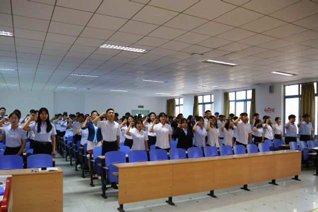 随后,酒店管理专业相关教师为志愿者作赛前动员并就志愿服务注意事项进行详细介绍和具体指导;18级酒店管理4班孙海博带领全体“金海豚”志愿者进行庄严宣誓。