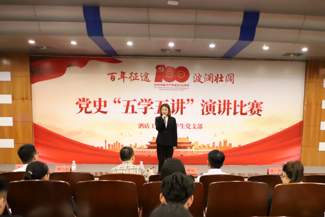 述往思来,向史而新。6月16日,酒店工程学院学生党支部启动“五学五讲”演讲比赛。参赛选手围绕“讲英烈”、“讲人物”、“讲战争”、“讲会议”、“讲精神”等主题,以铿锵有力的话语、声情并茂的表达、精神饱满的风貌,生动形象地讲述了中国共产党领导中国人民走过的百年奋斗历程,鼓舞广大青年学生从党史学习教育中重温永不忘却的初心,从红色传统中感悟历久弥新的信念。