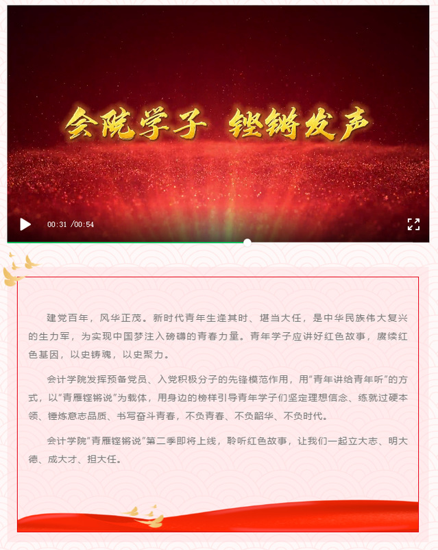 会计学院党总支着眼学懂弄通做实,推进党史学习教育落实落细。全体师生党员参加“知史爱党知史爱国” 党员学习竞赛;教师党员将学习成果录制成“红雁微党课”,学生党员将学习成果录制成“青雁铿锵说”,边学边思,形成学习心得体会,找不足,促改进。