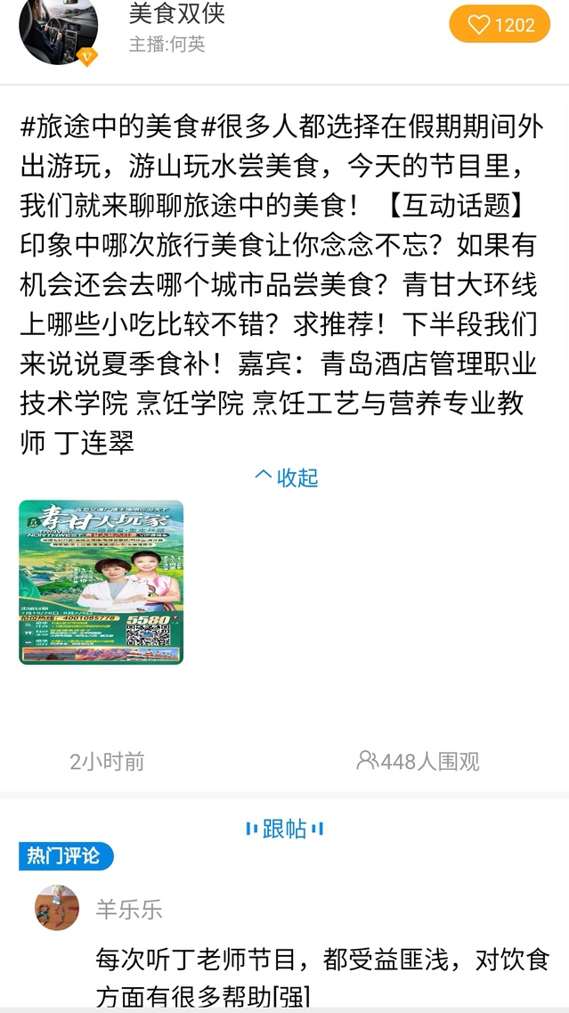 《美食双侠》是岛城餐饮行业的第一媒体品牌。节目中,丁连翠以夏季时令菜品养生保健为主题与听众进行交流,提醒大家切忌盲目养生,要依据节气特点和自身体质异同选择合理的膳食,因时、因人食养,保证人体的健康。节目听众积极参与讨论,表示丁老师对知识的讲解简单易懂,具有实际指导意义。
