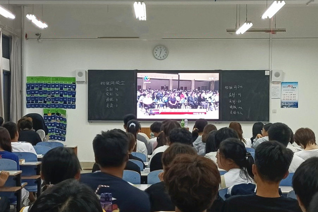本网讯(党委宣传统战部 周晓莉)为深入贯彻落实习近平总书记“七一”重要讲话精神,引导青年学生自觉践行“请党放心、强国有我”誓言,9月29日,各二级学院组织学生通过集中收看和分散学习相结合的方式观看《齐鲁大讲坛——开学第一讲》网络直播特别节目。