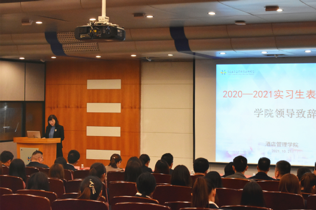 本网讯(酒店管理学院 王志飞)10月21日下午,酒店管理学院在学术报告厅召开2020-2021学年实习总结表彰大会,学院纪委书记姜玲玲参加活动。