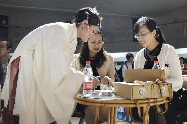 茶会在全体人员的净手仪式中拉开序幕,泡茶、品茶……品饮的过程让大家亲身体验了中国茶艺和茶道之美。随后,国学社的汉服走秀,充分展示了汉服风采和魅力;茶艺社通过茶艺展示、知识讲解、奉上敬师茶,在活动体验中增强知恩、感恩之情。