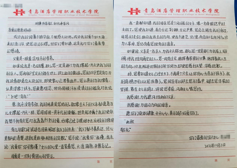 11月5-8日,工商管理学院开展了“一封家书说家风”活动,同学们广泛投稿、积极参与。最终,2021级商英3班李金慧的一封家书《明世传家教 知礼传家风》获得了一等奖。通过倡导家书文化,有助于提升学生的思想道德水平,帮助学生树立家国情怀,更加懂得感恩父母、感恩他人、感恩社会,激励同学们用青春的力量为国家建设添砖加瓦。