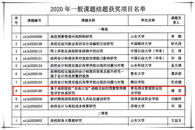 山东省教育会计学会隶属于山东省教育厅,主要职能是围绕我省教育财务中心工作,发挥社团组织的桥梁纽带作用,开展教育财会理论研究和学术交流,组织全省教育财会人员开展继续教育培训。据悉,此次评审共有来自山东大学、中国海洋大学、中国石油大学(华东)等高校的10项课题获得一等奖,学院获奖课题也是驻青高职院校唯一一项一等奖。