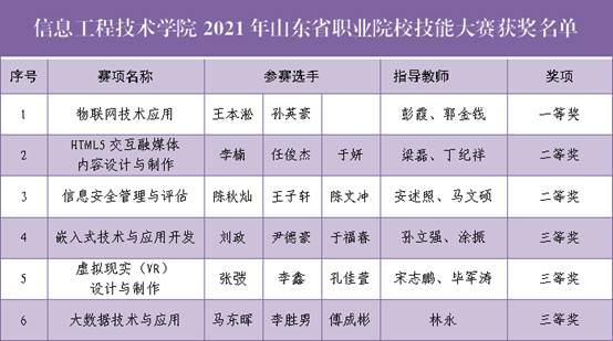 本网讯(信息工程技术学院 杨喆)近日,2021年度山东省职业院校技能大赛各赛项相继落下帷幕。信息工程技术学院参加“物联网应用技术”“HTML5交互融媒体内容设计与制作”等7个赛项比赛,喜获一等奖1项、二等奖2项、三等奖3项,取得了新的比赛成绩。