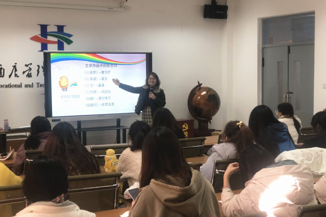 基础教学部蒲春芳老师以“揭开文学作品中的‘色彩’之谜”为题,将红、绿、蓝、白、黑等诸多颜色与中外文学作品、影视作品、传统习俗相结合,充分阐述了色彩在中西文化不同背景下所象征的不同意义。