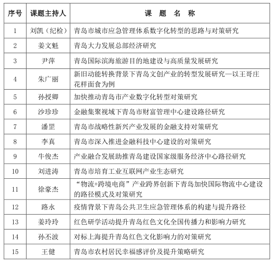 本网讯(科研发展处)近日,青岛市社会科学界联合会公布了2021年度“双百调研工程”课题立项结果,我院共有15项课题获立项资助,立项数在所有申报单位中排名第一。
