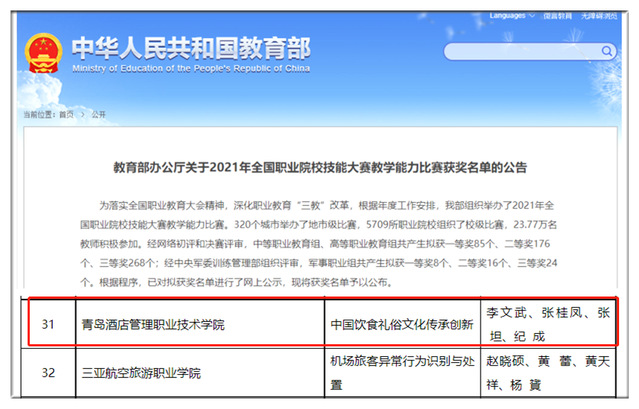 全国职业院校教学能力比赛是全面展示新时代职业教育改革成果与教师风采的高级别赛事。据统计,2021年,全国共有5709所职业院校组织了校级比赛,23.77万名教师积极参加。经网络初评和决赛评审,中等职业教育组、高等职业教育组共产生一等奖85个、二等奖176个、三等奖268个。其中,由山东省推荐参赛的我院烹饪学院李文武、张桂凤、张坦、纪成团队的参赛作品《中国饮食礼俗文化传承创新》荣获三等奖。