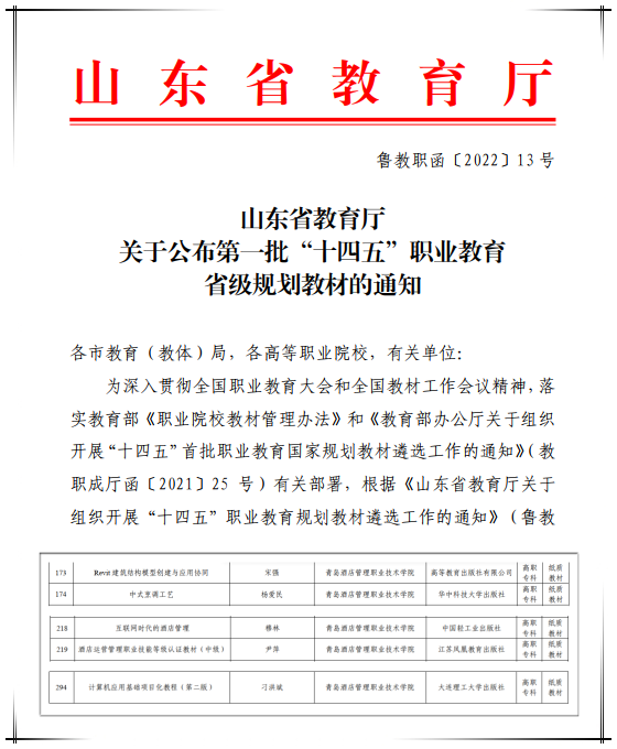 本网讯(教务处 宋玉莉)近日,山东省教育厅发布《 关于公布第一批“十四五”职业教育省级规划教材的通知》(鲁教职函〔2022〕13号),学校5部教材入选第一批“十四五”职业教育省级规划教材。