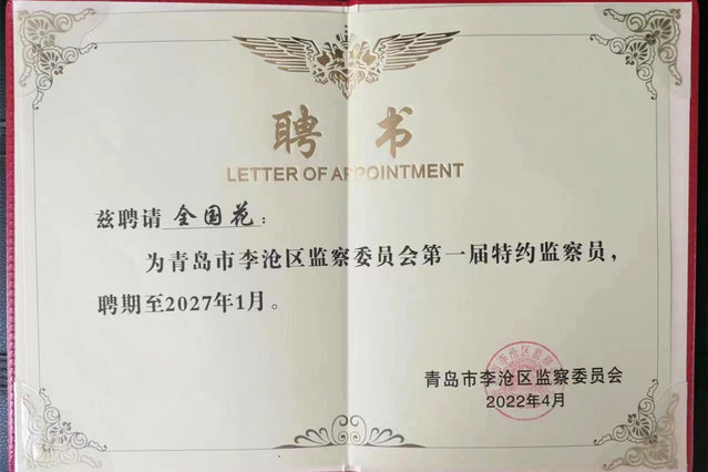 全国花老师表示,受聘为特约监察员既是荣誉也是责任,自己将提高站位、勇担使命,找准定位、充分履职,积极发挥参谋咨询作用和桥梁纽带作用,当一名合格的特约监察员。