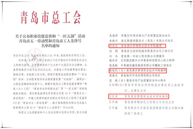 本网讯(工会 吴春雷)近日,青岛市总工会下发《关于公布职业技能竞赛和“一匠五创”活动青岛市五一劳动奖和青岛市工人先锋号名单的通知》,万象城官网烹饪学院张桂凤、任传生、王庆泉三名教师荣获“青岛市五一劳动奖章”。