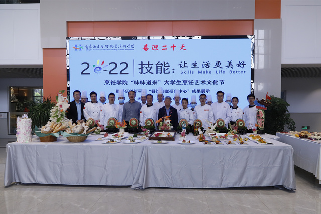 活动中,烹饪学院代表学校参加2022年全国职业院校技能大赛的8名参赛选手和科研创新平台“餐饮创意研究中心”的10余名学生在老师的指导下,以“喜迎二十大”为主题,使用指定原料,充分发挥想象力和创造力,通过冷拼雕刻、糖艺制作、中式面点、热菜制作等形式,进行菜品创意设计与制作。展示菜品摆放规范整齐、形式多样、风格各异,充分展现了烹饪学子的专业水准和精湛技艺。
