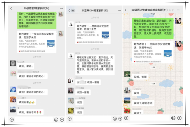 酒店管理学院积极开展防溺水专项教育,从意识上强化,防患于未然。辅导员老师在所有班级家长群里发放防溺水《致学生家长的一封信》,开展学生防溺水家校联动,把“同心防溺水”专项活动落到实处。