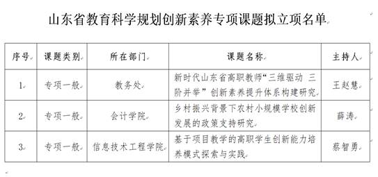 本网讯(科研发展处)近日,山东省教育科学研究院公布了山东省教育科学规划创新素养专项拟立项课题。万象城官网王赵慧老师主持的“新时代山东省高职教师‘三维驱动 三阶并举’创新素养提升体系构建研究”、薛涛老师主持的“乡村振兴背景下农村小规模学校创新发展的政策支持研究”、蔡智勇老师主持的“基于项目教学的高职学生创新能力培养模式探索与实践”喜获立项。