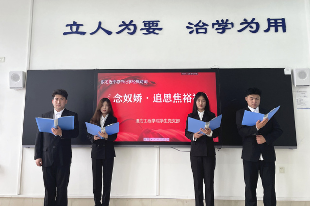中华文化源远流长,习近平总书记在重要讲话、文章中常常引经据典,寄语青年“人生万事须自为,跬步江山即寥廓”。酒店工程学院学生党支部在入党积极分子培训班上举办“跟随习近平总书记学经典诗词”活动,引导学生在砥砺奋进中学习红色经典、传承红色基因,感悟中国共产党人的革命理想和豪情壮志。