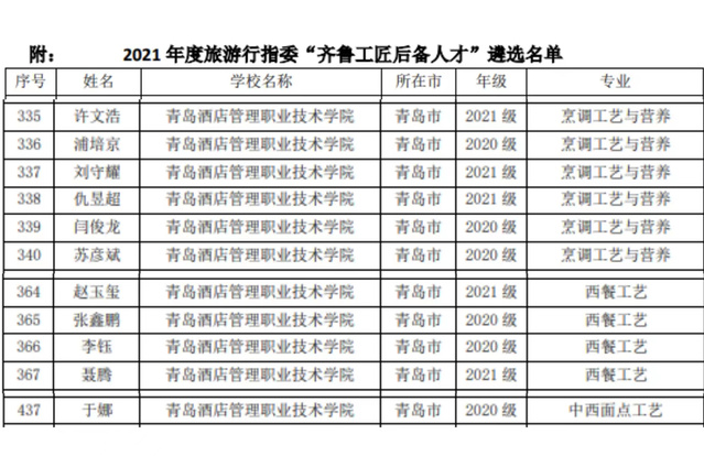 本网讯(烹饪学院 赵捷)近日,山东省旅游职业教育行业教学指导委员会公示了2021年度旅游大类“齐鲁工匠后备人才”培育对象遴选名单,全省共有440名学生被列为培育对象,万象城官网烹饪学院11名学生入选。