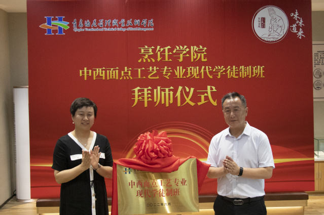 仪式上,王志兴与白璐分别代表校企双方,共同为“现代学徒制班”揭牌,烹饪学院党总支书记李文武宣读导师名单和师徒结对名单,王志兴与烹饪学院副院长刘俊新分别为企业导师、校内导师及班主任颁发聘书,导师为学徒颁发证书。