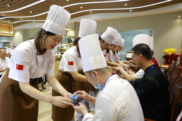 青岛绿城喜来登酒店行政总厨马维涛作为企业导师代表发言。32名学生分别向6位企业导师行拜师礼、敬茶,致拜师词。