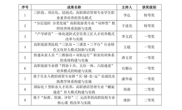 职业教育教学成果奖是职业教育领域最高层次的奖励,每四年评审一次,旨在奖励职业院校在教育教学理论及实践中取得的重大突破。学校高度重视教学成果奖的培育和申报工作,将省级教学成果奖获奖列为年度重点工作任务,多次邀请省内外职教专家开展培训指导,历经多轮梳理、创新、凝练和打磨,最终九项成果获奖。其中,李达教授主持的《三阶段、项目化、浸润式:高职酒店管理专业学生职业素养培养的青岛模式》和于进亮副教授主持的《“分层进阶 分类发展”高职旅游类专业“双师型”教师培养体系创新与实践》两项成果荣获省级教学成果特等奖。