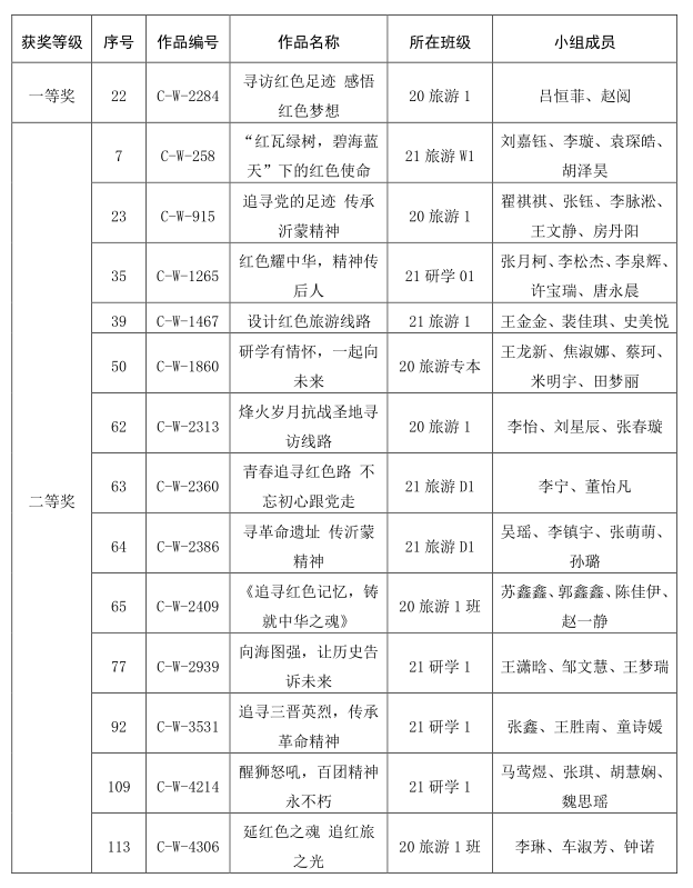 本网讯(文旅学院 田张珊)近日,中国旅游协会旅游教育分会发布了《第十二届全国大学生红色旅游创意策划大赛初赛获奖及入围决赛名单》,文旅学院参赛团队共获奖项14项,其中一等奖1项、二等奖13项,刷新学校参与此项比赛纪录。