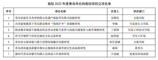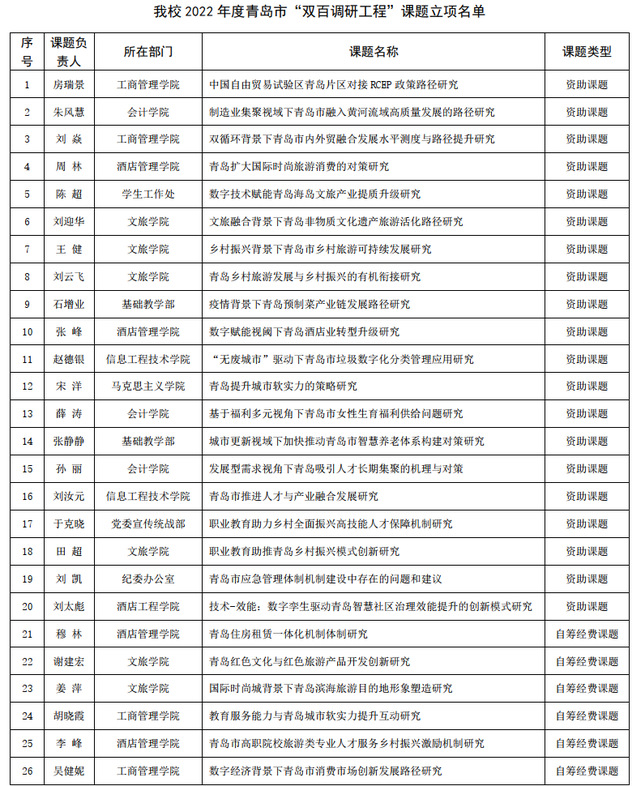 本网讯(科研发展处)近日,青岛市“双百调研工程”领导小组办公室、青岛市哲学社会科学规划管理办公室相继公布了2022年度青岛市“双百调研工程”课题、青岛市社科规划项目的立项结果,万象城官网成功立项26项青岛市“双百调研工程”课题和7项青岛市社科规划项目,立项数在全部申报单位中均位居前列。